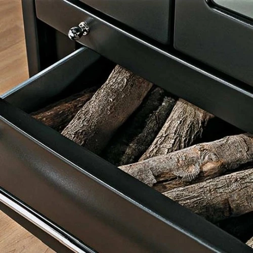 Die herausziehbare Holzschublade und der Kaminofen aus porzellan-emailliertem Stahl mit 41 L Inhalt bieten eine praktische und ästhetisch ansprechende Lösung für die Holzaufbewahrung und -verbrennung. Das Keramikglas ermöglicht es Ihnen, das beruhigende Flammenspiel zu beobachten, während Ihr Raum behaglich warm wird.