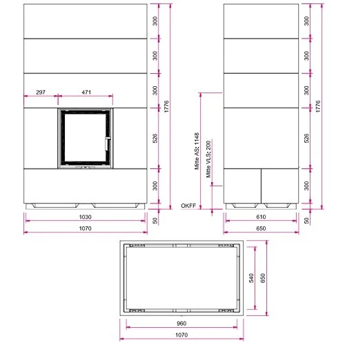 - Höhe 1776 x Breite 1070 x Tiefe 650 mm, Gesamtgewicht: 670/689/707/757 kg (je nach Kamineinsatz)