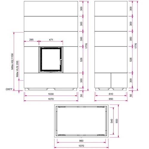 - Höhe 1776 x Breite 1070 x Tiefe 650 mm, Gesamtgewicht: 670/689/707 kg (je nach Kamineinsatz)