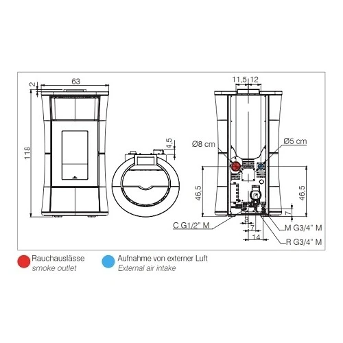 Mit einer Raumheizkapazität von 154 m² und einem wasserführenden System produziert der Pelletofen heißes Wasser, das Heizkörper und Fußbodenheizungen im ganzen Haus speisen kann. Er kann auch mit Solarpaneelen kombiniert werden, um ein modernes Heizsystem zu schaffen.
