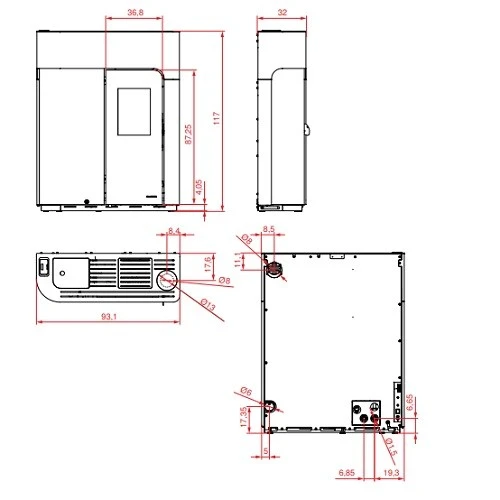 Die Verbrennungsluftzufuhr wird direkt von Außen zugeführt. Der Ofen ist somit bestens für Niedrig- und Passivenergiehäuser geeignet. Die breite Glaskeramikscheibe bleibt dank des Scheibenreinigungssystems frei von Ruß. Die Tür, der Feuerraum und die Brennschale aus extra starkem Gusseisen sind robust und langlebig. Die Brennschale sorgt außerdem dafür, dass die Asche in die direkt darunter liegende aufnahmefähige Aschelade fällt.
