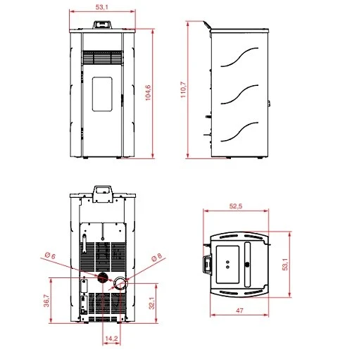 – Pelletofen aus hochwertigen Materialien wie einer Brennschale aus extra starkem Gusseisen, während Struktur und Verkleidung aus Stahl sind. Auch die Abdeckplatte besteht aus Gusseisen.
